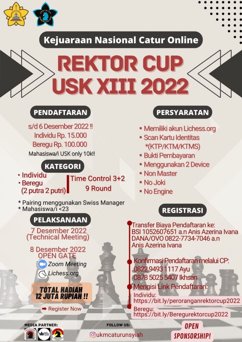 Sebanyak 110 atlet catur yang merupakan mahasiswa-mahasiswi terbaik dari berbagai perguruan tinggi di Indonesia mengikuti Kejuaraan Nasional Catur Online Rektor USK Cup XIII di arena server lichess menggunakan system pairing swiss manager. (Banda Aceh, 8 Desember 2022).
