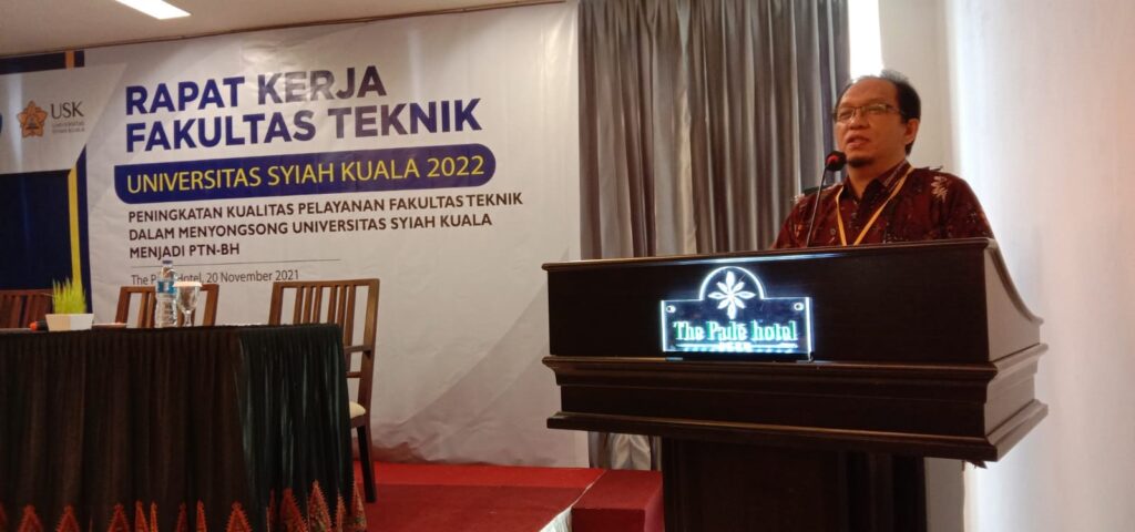 Fakultas Teknik Universitas Syiah Kuala (USK) menggelar rapat kerja tahun 2022 di Hotel The Pade Banda Aceh, Sabtu (20/11/2021). Kegiatan ini diikuti ratusan civitas akademika yang mewakili berbagai unit kerja di fakultas teknik USK. Tahun ini raker dilakukan secara hybrid, baik luring maupun daring.