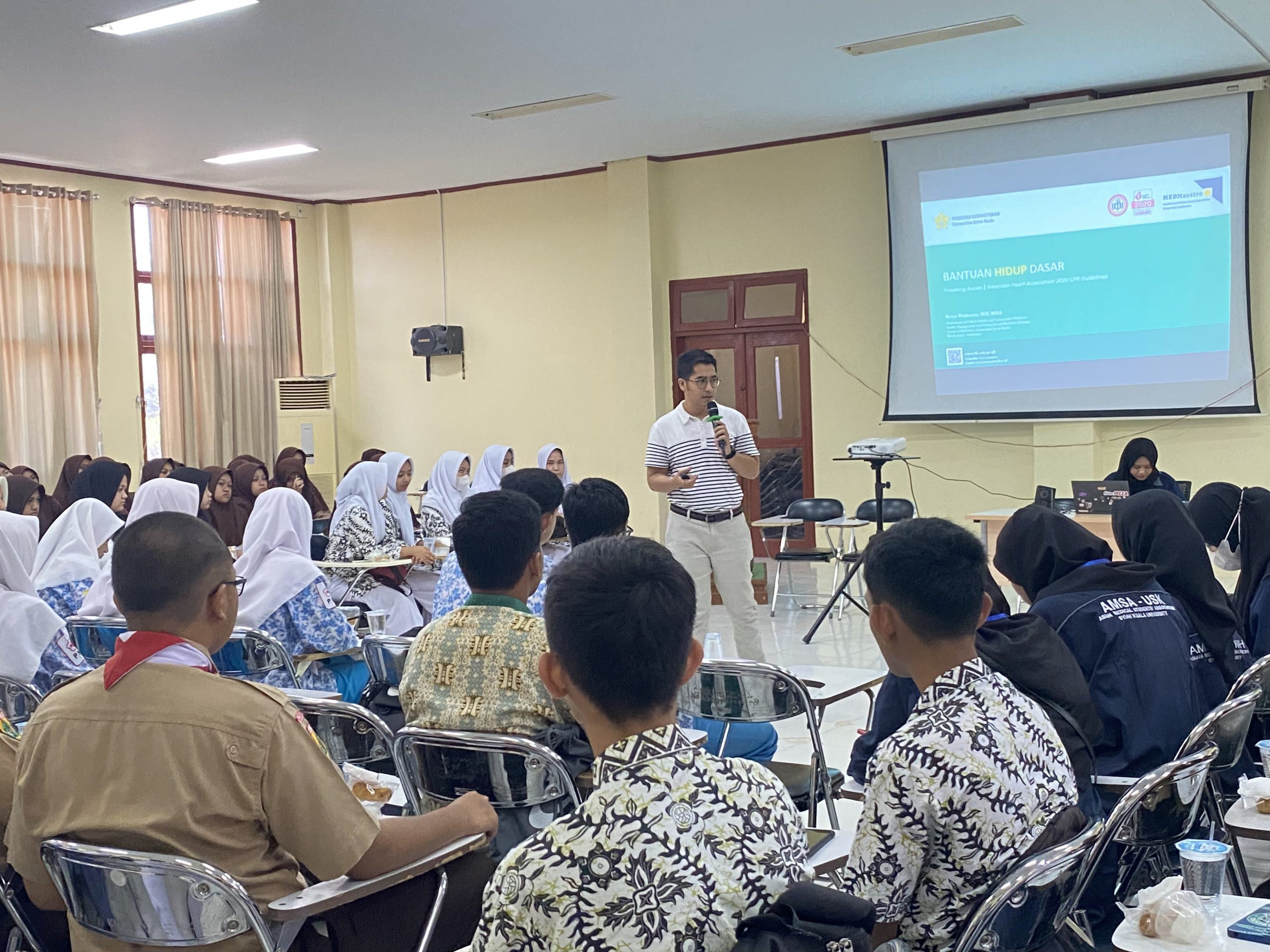 Mahasiswa FK USK yang juga tergabung daribagian Asian Medical Students’ Association – Universitas Syiah Kuala (AMSA-USK) memberikan pelatihan Bantuan Hidup Dasar (BHD) kepada 158 pelajar SMA Se-Banda Aceh dan Aceh Besar pada acara Let’s Go to BLS (LEGO) di Gedung F FK USK. (Banda Aceh, 6 Mei 2023).