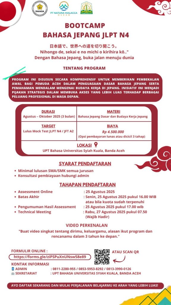 Universitas Syiah Kuala (USK) melalui UPT Bahasa, bekerja sama dengan PT Natuna Malacca Ocean, resmi meluncurkan Bootcamp Bahasa Jepang JLPT N4 (Japanese Language Proficiency Test Level N4). Program ini dirancang khusus untuk mempersiapkan generasi muda Aceh menguasai bahasa Jepang serta memahami budaya dan etos kerja di Jepang. Banda Aceh.