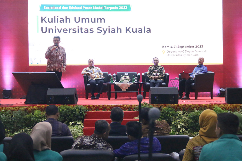 Otoritas Jasa Keuangan (OJK) menggelar kuliah umum untuk mengedukasi mahasiswa Universitas Syiah Kuala terkait Pasar Modal Terpadu 2023. Kegiatan tersebut berlangsung di Gedung AAC Dayan Dawood. (Banda Aceh, 21 September 2023).Direktur Utama PT. Bursa Efek Indonesia (BEI) Iman Rachman mengatakan, kegiatan edukasi pasar modal ini merupakan program yang diinisiasi oleh OJK dan melibatkan sejumlah lembaga