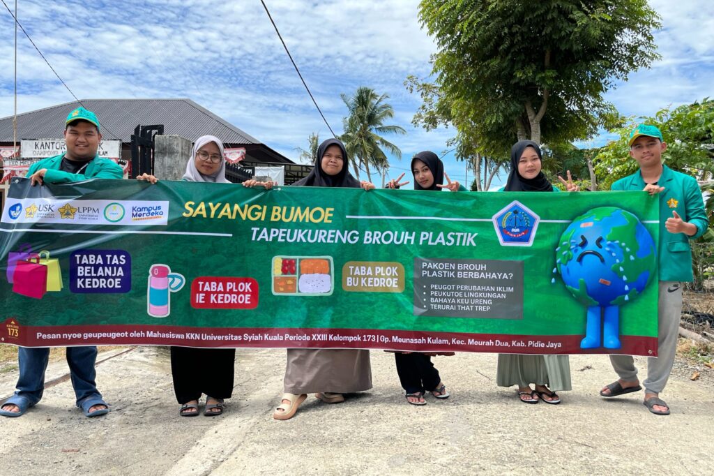 Mahasiswa Kuliah Kerja Nyata (KKN) Universitas Syiah Kuala yang tergabung dalam kelompok 73 mengajak masyarakat Gampong Meunasah Kulam Kulam, Kecamatan Meurah Dua, Kabupaten Pidie Jaya untuk melestarikan lingkungan dengan mengurangi pelastik. Mahasiswa KKN USK tersebut terdiri dari enam orang yaitu M Ghopar Azizi, Muhammad Hafidh Al-Fazi, Lia Kartika K, Cut Nur Ainun Zahara, Laisa Sara Sabrina, dan Nadyaturrahmah. Mereka mengambil inisiatif untuk mengajak masyarakat untuk menyayangi bumi dengan mengurangi penggunaan plastik, karena melihat banyaknya masyarakat yang masih menggunakan plastik sekali pakai dan membuang sampah sembarangan. Dalam upaya mengurangi penggunaan plastik sekali pakai, mereka memasang spanduk ajakan dalam