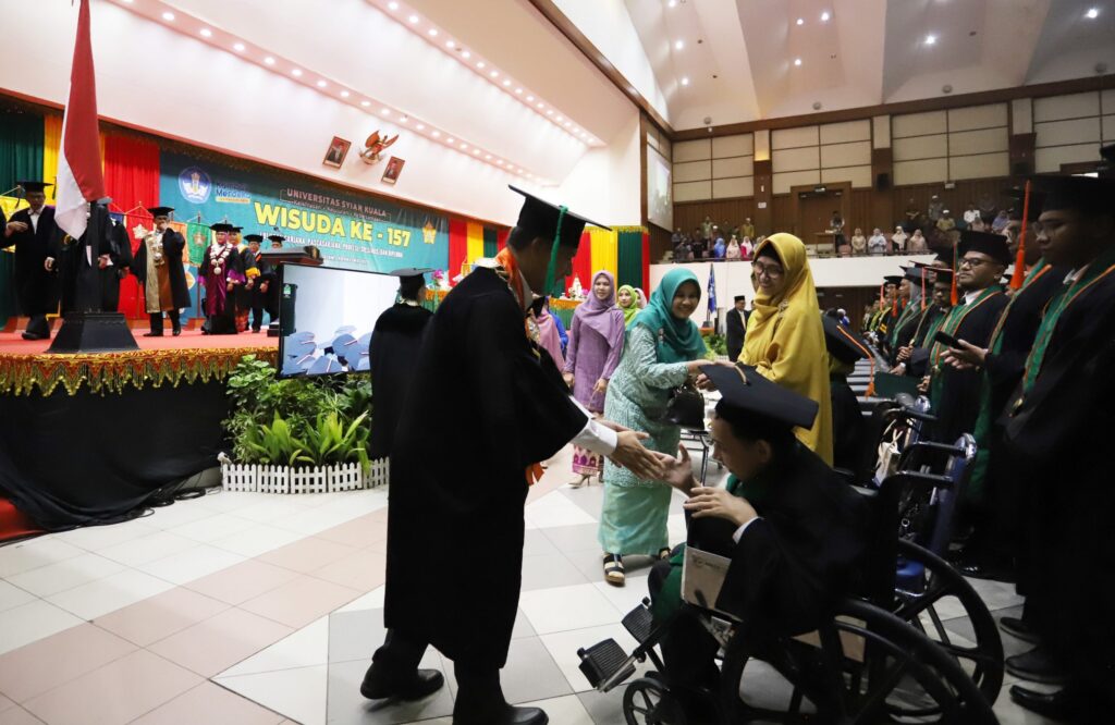 Wisuda Universitas Syiah Kuala ke-157 yang dilaksanakan di Gedung AAC Dayan Dawood terasa istimewa, karena dari ribuan lulusan tersebut terdapat dua wisudawan yang menyandang disabilitas. (Banda Aceh, 25 Mei 2023). Kedua lulusan tersebut adalah Desi Arisandy dari Program Studi S1 Teknik Geologi, yang lulus dengan predikat memuaskan. Lalu Tuanku Muhammad Athaya dari Program Studi DIII Manajemen Informatika,