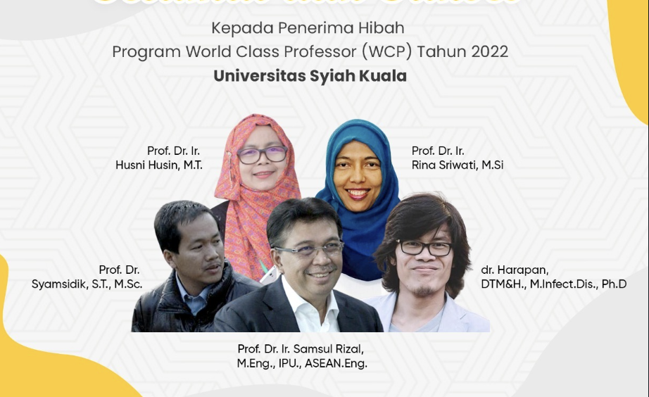 Universitas Syiah Kuala (USK) meneruskan tren positif pada kompetisi program hibah World Class Professor (WCP) tahun 2022. Lima dosen USK, berhasil memenangkan hibah yang diinisiasi oleh Kementerian Pendidikan dan Kebudayaan Republik Indonesia melalui Direktorat Jenderal Pendidikan Tinggi (DIKTI). Kelima dosen USK tersebut adalah, Prof. Dr. Ir. Samsul Rizal, M.Eng., IPU, ASEAN.Eng, Prof. Husni Husin, MT,