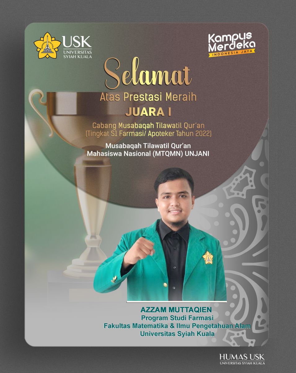 Mahasiswa Program Studi (Prodi) Farmasi Universitas Syiah Kuala (USK), Azzam Muttaqien berhasil meraih juara 1 pada Musabaqah Tartil Quran nasional tingkat S1 Farmasi/Apoteker yang diselenggarakan oleh Universitas Jenderal Ahmad Yani (UNJANI). Azzam Muttaqien merupakan utusan tinggal dari USK. Pada MTQ ini, terdapat empat kategori dalam perlombaan, diantaranya SMA/MA/SMK Putra, SMA/MA/SMK Putri, Farmasi/Apoteker Putra, dan Farmasi/Apoteker