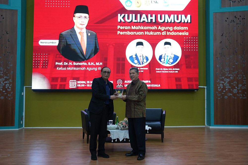 Universitas Syiah Kuala (USK) menyelenggarakan Kuliah Umum yang berfokus pada peran strategis Mahkamah Agung (MA) dalam pembaruan hukum di Indonesia. Kegiatan ini, serangkaian dengan sejumlah agenda peringatan Milad USK ke-64. Acara yang berlangsung di Aula FMIPA, Senin (15/9), ini menghadirkan Ketua MA, Prof. Dr. H. Sunarto, S.H., M.H., yang menekankan urgensi reformasi hukum di tengah
