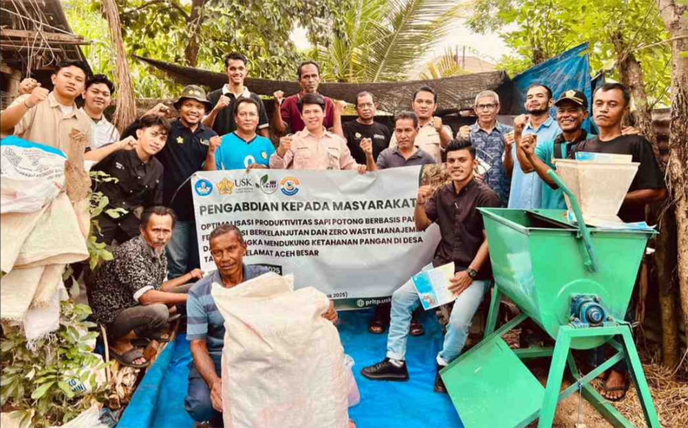 Tim akademisi dari Universitas Syiah Kuala (USK) kembali menunjukkan komitmennya dalam mendukung ketahanan pangan nasional. Melalui program pengabdian kepada masyarakat, tim dari Departemen Peternakan dan Kedokteran Hewan USK memperkenalkan teknologi pakan fermentasi dan manajemen limbah ‘zero waste’ kepada peternak di Desa Tanjung Selamat, Kabupaten Aceh Besar. Program yang menyasar Kelompok Ternak “Beuna Hase” ini bertujuan