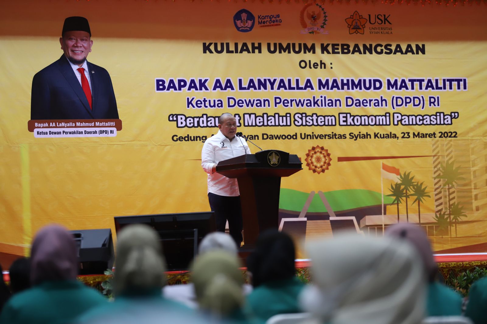 Universitas Syiah Kuala terus memperkuat komitmennya untuk mendukung upaya pemerintah dalam mewujudkan kedualatan ekonomi nasional. Pernyataan tersebut disampaikan oleh Rektor USK Prof. Dr. Ir. Marwan pada kuliah umum Ketua Dewan Perwakilan Daerah (DPD) di Gedung AAC Dayan Dawood. (Banda Aceh, 24 Maret 2022). Prof. Marwan mengatakan, salah satu wujud dari komitmen tersebut adalah USK telah
