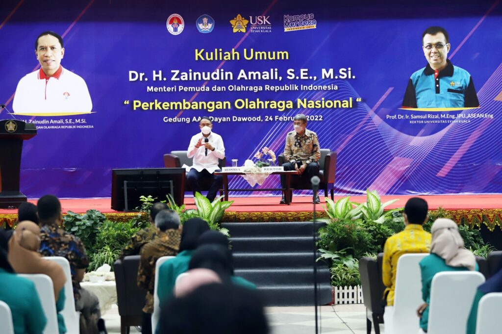 Menteri Pemuda dan Olah Raga Republik Indonesia, Dr. H. Zainudin Amali, SE., M.Si menyampaikan keinginannya agar Aceh masuk ke dalam grand desain olahraga nasional. Hal itu ia sampaikan pada kuliah umum di Universitas Syiah Kuala (USK) dengan tema ‘Perkembangan Olahraga Nasional’ di Gedung AAC Dayan Dawood. (Banda Aceh, 24/2/2022) “Aceh harus masuk dalam desain besar