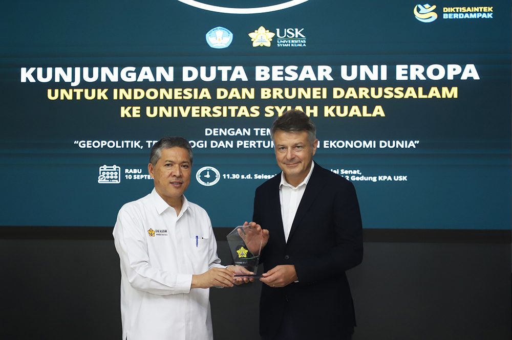 Universitas Syiah Kuala (USK) menerima kunjungan kehormatan dari Duta Besar Uni Eropa (UE) untuk Indonesia dan Brunei Darussalam, H.E. Mr. Denis Chaibi, Rabu, 10 September 2025. Kunjungan yang berlangsung di Gedung Balai Senat USK ini bertujuan mempererat hubungan diplomatik dan menjajaki potensi kerja sama di berbagai bidang strategis. Dihadiri oleh mahasiswa internasional dari beragam negara