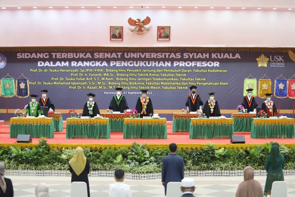 Universitas Syiah Kuala (USK) kembali mengukuhkan lima profesor baru dalam Sidang Senat Terbuka yang dipimpin oleh Ketua Senat, Prof. Dr. Ir. Abubakar, MS. Pengukuhan ini dilaksanakan secara daring dan luring dari Gedung AAC Dayan Dawood. (Banda Aceh, 7 September 2021). Mereka yang dikukuhkan kali ini adalah Prof. Dr. dr. Teuku Heriansyah, Sp. JP (K)-FIHA.,FESC.,FAsCC., Prof.