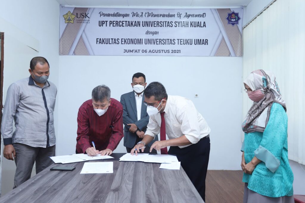 Percetakan Universitas Syiah Kuala (USK) menandatangani Memorandum of Agreement (MoA) dengan Fakultas Ekonomi (FE) Universitas Teuku Umar (UTU). Kerjasama ini ditandatangani oleh Dekan FE UTU, Prof. Dr. T. Zulham, M.S bersama Kepala UPT Percetakan USK, Dr. T. Meldi Kesuma, S.E., M.M di gedung setempat. Turut disaksikan Wakil Rektor IV USK, Prof. Dr. Hizir. (Banda Aceh,