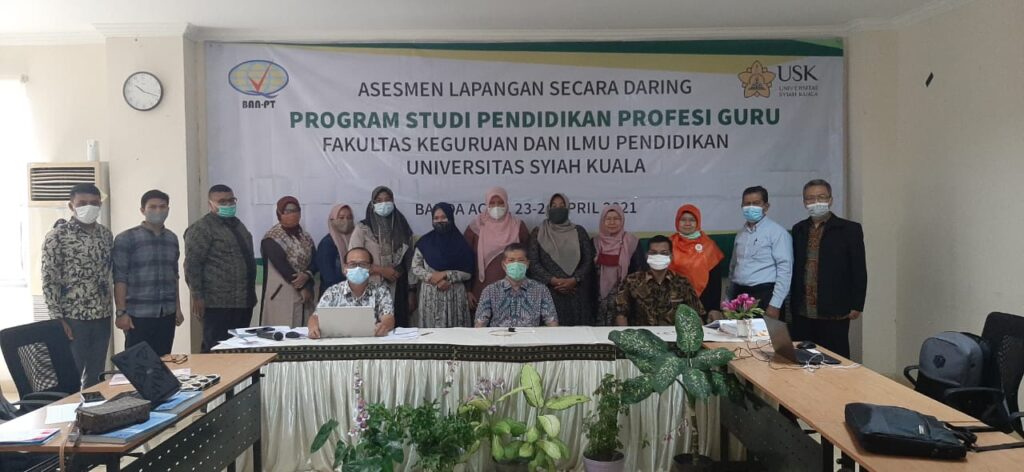 Badan Akreditasi Nasional Perguruan Tinggi (BAN-PT) melakukan asesmen Pendidikan Profesi Guru pada Fakultas Keguruan dan Ilmu Pendidikan Universitas Syiah Kuala. Kegiatan secara daring ini dilakukan mulai tanggal 23 – 24 April 2021 oleh Tim Asesor BAN PT yaitu Dr. Udik Budi Wibowo, M.Pd. dan Dr. Susilahati, M.Si. (Banda Aceh, 5 Mei 2021). Kegiatan ini dibuka