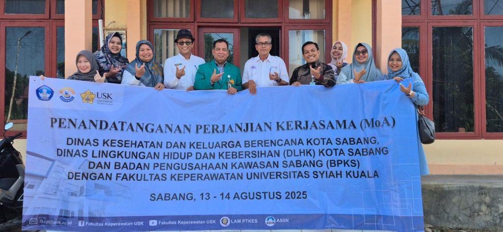 Fakultas Keperawatan Universitas Syiah Kuala (FKep USK) melakukan kunjungan kerja ke Kota Sabang pada 13–14 Agustus 2025 untuk memperkuat jejaring kemitraan strategis. Kunjungan ini ditandai dengan penandatanganan perjanjian kerja sama dengan tiga instansi utama, yaitu Dinas Kesehatan dan Keluarga Berencana, Dinas Lingkungan Hidup dan Kebersihan (DLHK), serta Badan Pengusahaan Kawasan Sabang (BPKS). Sabang, 14 Agustus 2025.