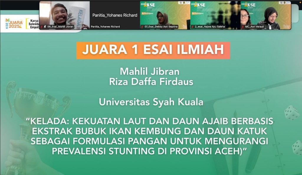 Dua mahasiswa Pendidikan Dokter Fakultas Kedokteran Universitas Syiah Kuala (USK), Mahlil Jibran dan Riza Daffa Firdaus, menorehkan prestasi gemilang di kancah nasional. Mereka berhasil meraih Juara 1 Lomba Esai Ilmiah KSE JUARA 2025, yang diselenggarakan oleh Paguyuban Karya Salemba Empat (KSE) Universitas Sumatera Utara. Kompetisi bergengsi ini mengusung tema “Innovate for Nusantara: Transformasi Ekosistem Nasional