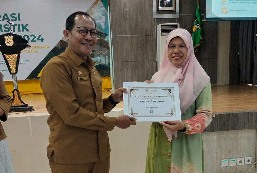 Universitas Syiah Kuala menerima penghargaan sebagai Mitra BPS Terbaik. Penghargaan tersebut diserahkan oleh Kepala Badan Pusat Statistik (BPS) Kota Banda Aceh Tedi Heriawan, S.Sos, M.A.P kepada Pranata Humas Muda USK Hayatana, SE pada kegiatan Literasi Statistik di Aula Lantai IV Gedung Mawardy Nurdin. (Banda Aceh, 26 November 2024). USK menerima penghargaan tersebut mewakili dunia akademik.
