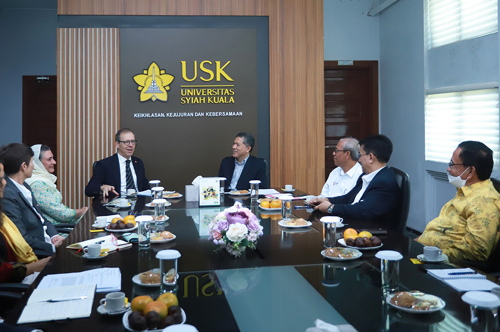 Rektor Universitas Syiah Kuala (USK) Prof. Dr. Ir. Marwan menerima kunjungan Duta Besar Swiss untuk Indonesia, H.E Mr. Olivier Zehnder, serta delegasi dari Organisasi Buruh Internasional (ILO) di Ruang Mini Rektor USK. (Banda Aceh, 14 Oktober 2024). Dalam sambutannya, Rektor menyampaikan saat ini USK terus berupaya menjalin serta mempererat kerja sama dengan berbagai mitra dari