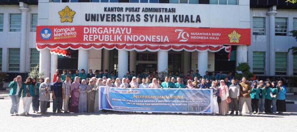 Universitas Syiah Kuala (USK) melepas mahasiswa peserta Program Wirausaha Merdeka 2024 untuk melaksanakan kegiatan immersion ke Usaha Kecil dan Menengah (UKM) mitra. Acara pelepasan ini berlangsung pada Kamis, 10 Oktober 2024 di Halaman Kantor Pusat Administrasi (KPA) USK, dan dihadiri oleh para mahasiswa, pimpinan universitas, dosen pendamping lapangan (DPL) serta perwakilan UKM mitra. Program Wirausaha