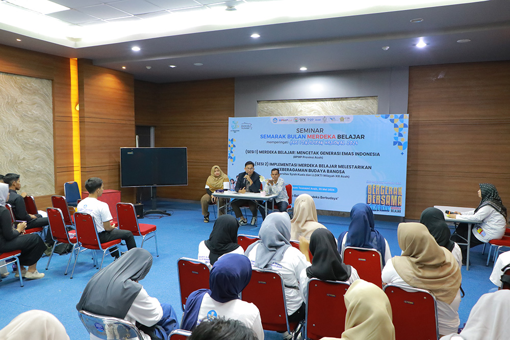 Dosen Fakultas Keguruan dan Ilmu Pendidikan (FKIP) Universitas Syiah Kuala T. Bahagia Kesuma, S.Pd., M.Pd menjadi narasumber pada kegiatan seminar pendidikan Bulan Merdeka Belajar di Museum Tsunami Aceh. Pada kesempatan itu, Dosen USK ini memaparkan peran kurikulum merdeka untuk mendukung pembangunan Indonesia. (Banda Aceh, 24 Mei 2024). Bahagia Kesuma mengatakan, ketersediaan SDM yang berkualitas adalah