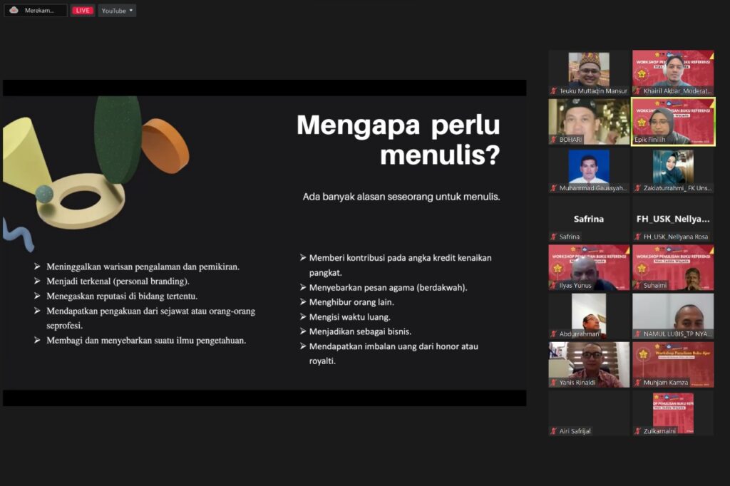 Fakultas Hukum Universitas Syiah Kuala (FH USK) menyelenggarakan workshop penulisan buku referensi, dengan menghadirkan pemateri dari Bogor, Epik Finilih secara daring. (Banda Aceh, 21 September 2022).