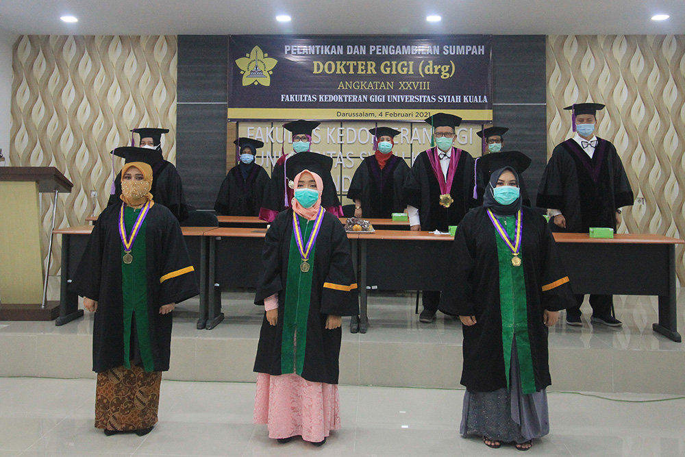 Fakultas Kedokteran Gigi (FKG) Universitas Syiah Kuala (USK) melantik sebanyak 51 Dokter Gigi baru. Pelantikan yang dibarengi dengan pengambilan sumpah dokter gigi ini dilakukan oleh Dekan FKG Unsyiah, Drg. Cut Soraya, M.Pd., Sp.KG dalam kegiatan resmi “Pelantikan dan Pengambilan Sumpah Dokter Gigi Angkatan 28 Tahun 2021”. Kegiatan ini dilakukan secara daring dan juga luring di Aula FKG USK, Kamis (4/2).