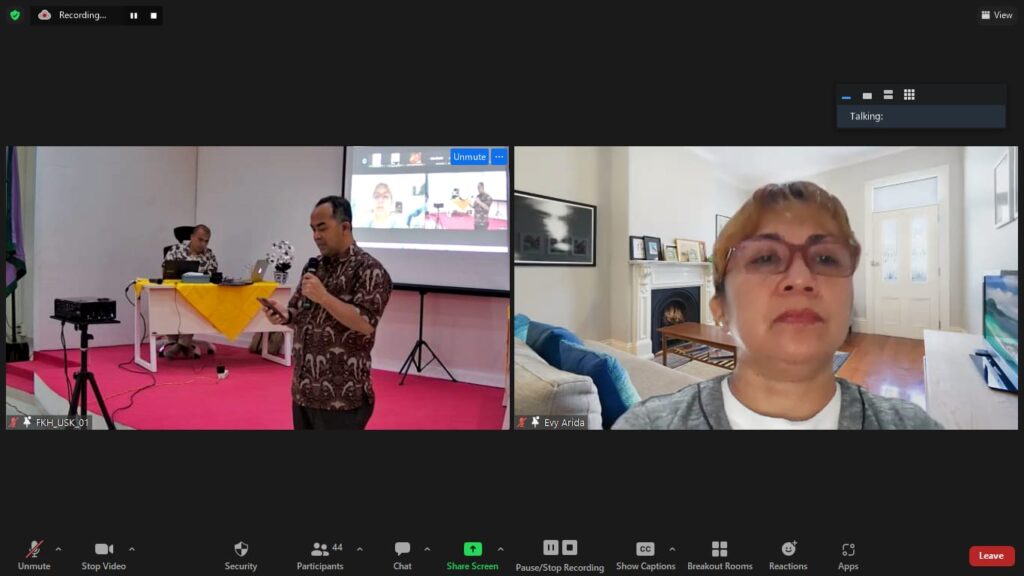 Kegiatan yang dilaksanakan secara luring dan daring ini dibuka oleh Dekan FKH USK drh. Teuku Reza Ferasyi, M.Sc., Ph.D. Dalam sambutannya, Teuku Reza menyampaikan apresiasi dan terima kasih atas kesediaan Evy yang hadir secara luring untuk memberikan materi.