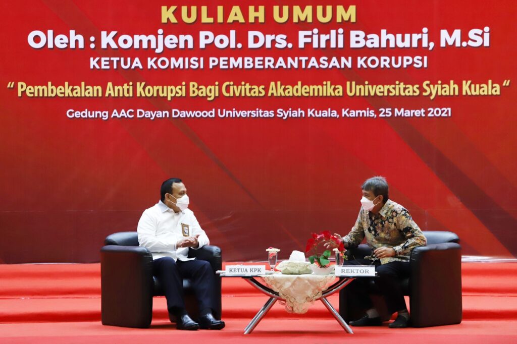 Ketua Komisi Pemberantasan Korupsi (KPK), Komjen Pol. Drs. Firli Bahuri, M.Si menyambangi Universitas Syiak Kuala (USK) dalam rangka silaturahmi dan memberikan kuliah umum di AAC Dayan Dawood. Kunjungan tersebut disambut hangat Rektor USK, Prof. Dr. Ir. Samsul Rizal, M.Eng. (Banda Aceh, 25 Maret 2021)