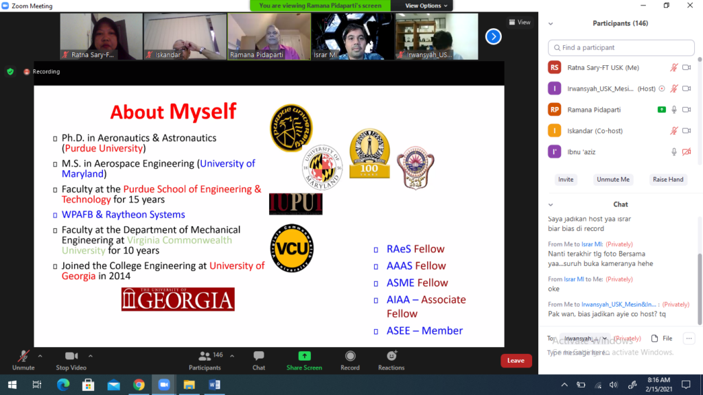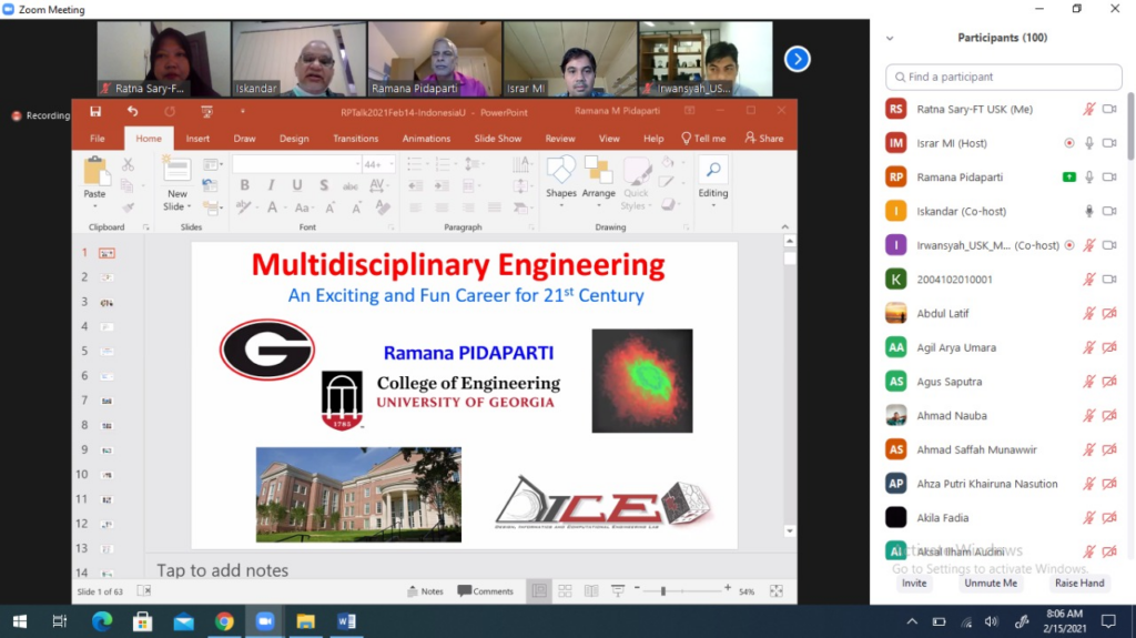 Kuliah perdana Jurusan Teknik Mesin dan Industri Fakultas Teknik Universitas Syiah Kuala menghadirkan dosen tamu secara daring yaitu Profesor Ramana Pidaparti dari Universitas Georgia Amerika Serikat dengan Tema: Lecture Speech: Introduction to Mechanical Application Industry Pra and Post the Covid-19 Pandemic. (Banda Aceh, 15 Februari 2021).