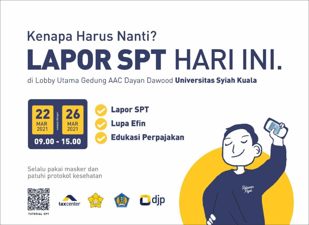 Kini DJP hadir di Universitas Syiah Kuala untuk membantu proses Lapor SPT, Lupa Efin dan Edukasi Perpajakan di Lobby Utama Gedung AAC Dayan Dawood, mulai tanggal 22 Maret 2021 sampai 26 Maret 2021 dari pukul 09.00-15.00