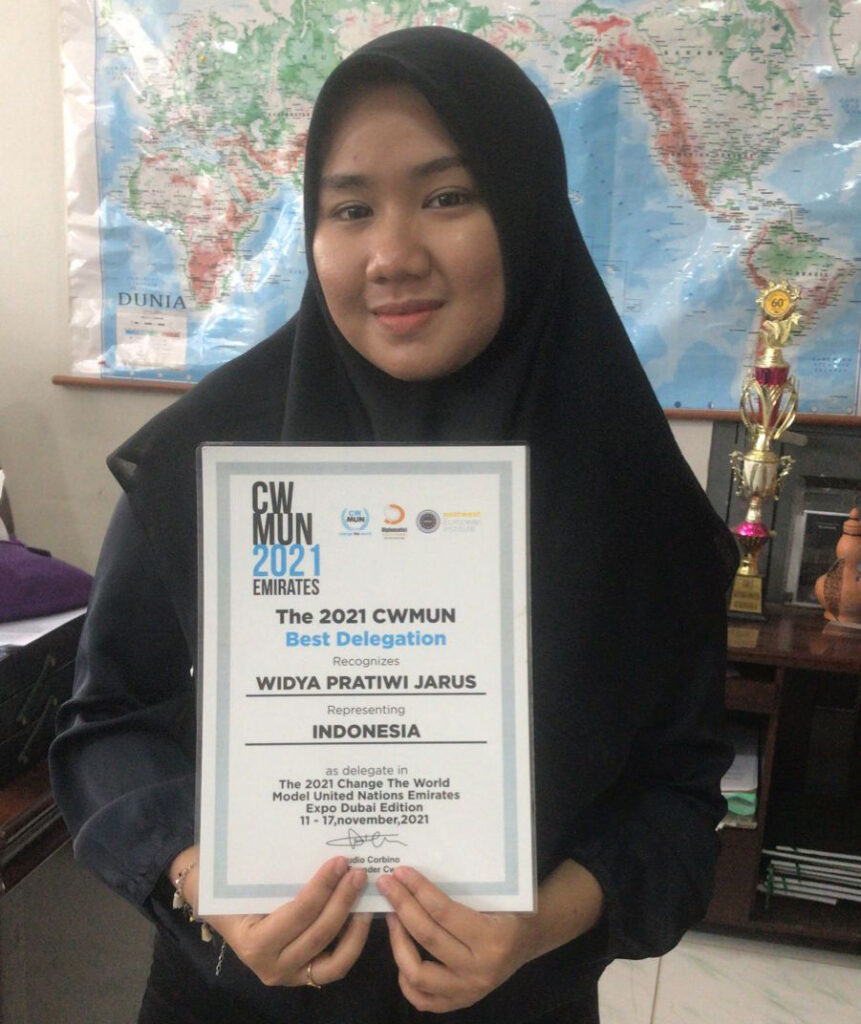 Widya Pratiwi Jarus, mahasiswa International Business and Economics Program (IBEP), Fakultas Ekonomi dan Bisnis (FEB) Universitas Syiah Kuala (USK) berhasil meraih predikat best delegation pada ajang Internasional Change the World Model United Nation (CWMUN) 2021 di Dubai. Berita gembira ini diperoleh setelah hari puncak kegiatan ini berlangsung, pada 17 November 2021 lalu.