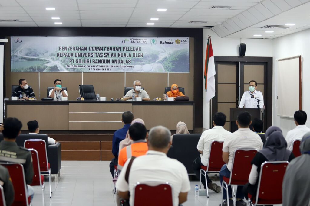 Perusahaan semen yang berlokasi di Lhoknga, Aceh Besar yaitu PT Solusi Bangun Andalas (PT SBA) menyerahkan dummy bahan peledak untuk Program Studi Teknik Pertambangan Fakultas Teknik Universitas Syiah Kuala. Dummy bahan peledak tersebut diserahkan oleh Head of External Relation PT SBA Win Bernadino kepada Dekan FT USK Prof. Dr. Ir. Alfiansyah Yulianur BC di Balee Keureukon Fakultas Teknik USK. (Banda Aceh, 27 Desember 2021).