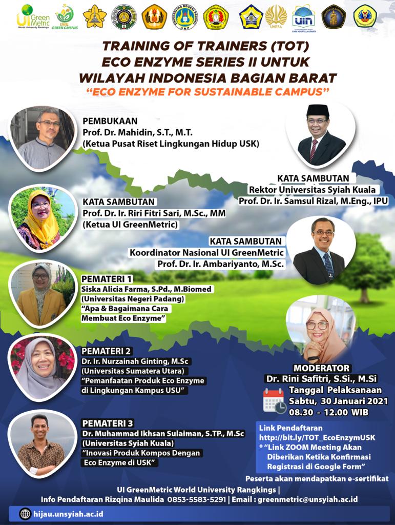 Pusat Riset Lingkungan Hidup USK dan Tim Eco Enzyme UI Greenmetric menggelar kegiatan Training of Trainers (ToT) Eco Enzyme Series II. Kegiatan yang berlangsung secara daring ini dihadiri oleh 207 peserta dari perwakilan Universitas Negeri maupun swasta wilayah bagian barat dengan tema Eco Enzyme for Sustainable Campus. (Banda Aceh, 30 Januari 2021).