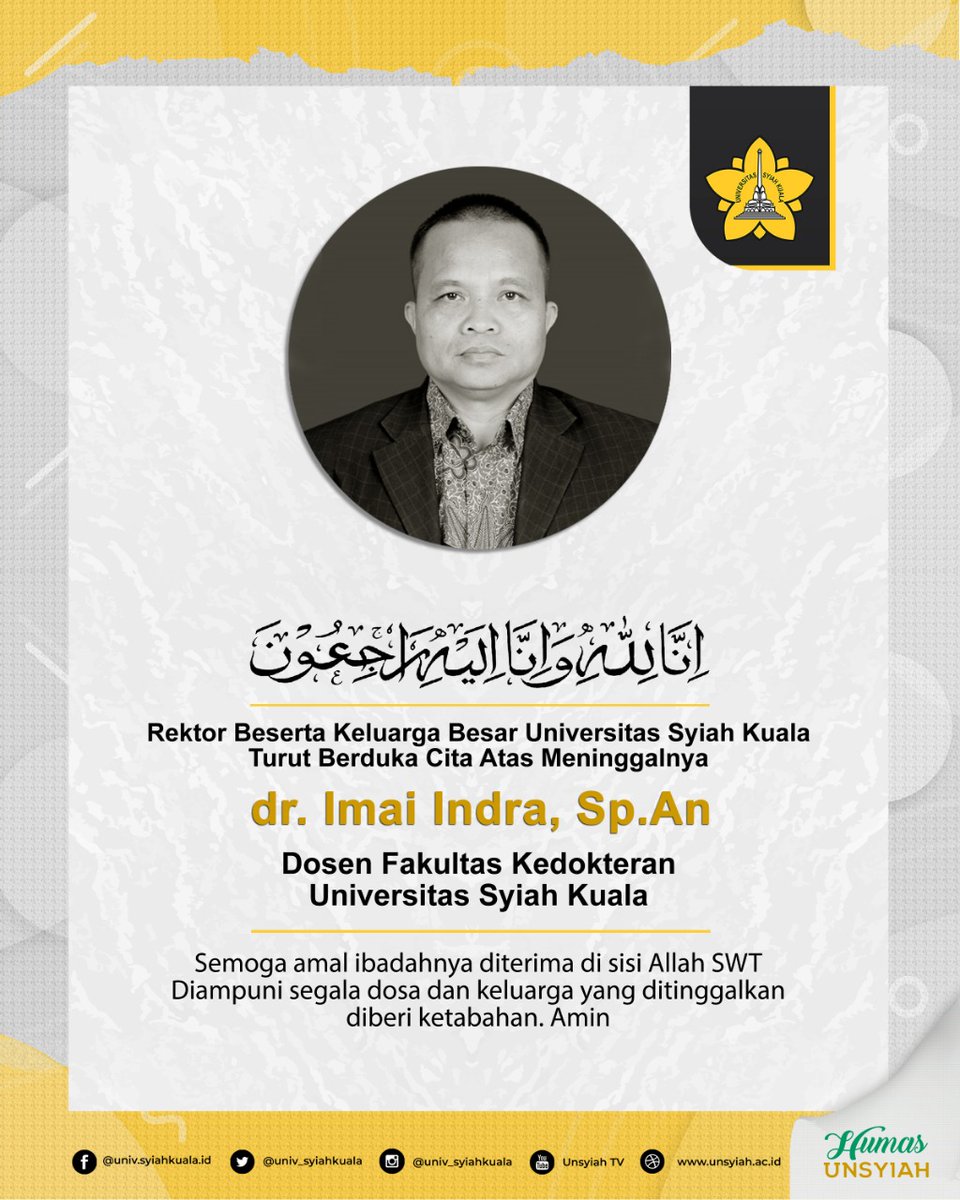Sebagaimana diketahui, Imai Indra yang Dosen FK itu meninggal akibat Covid-19 pada Rabu (2/9/2020) pukul 09.40 WIB di Rumah Sakit Umum dr Zainoel Abidin (RSUZA) Banda Aceh setelah lebih dari dua minggu berjuang melawan rongrongan virus. Imai Indra yang ahli anestesi (pembiusan) itu diyakini terinfeksi Covid-19 setelah melakukan tindakan medis terhadap seorang pasien Covid-19 beberapa waktu lalu.