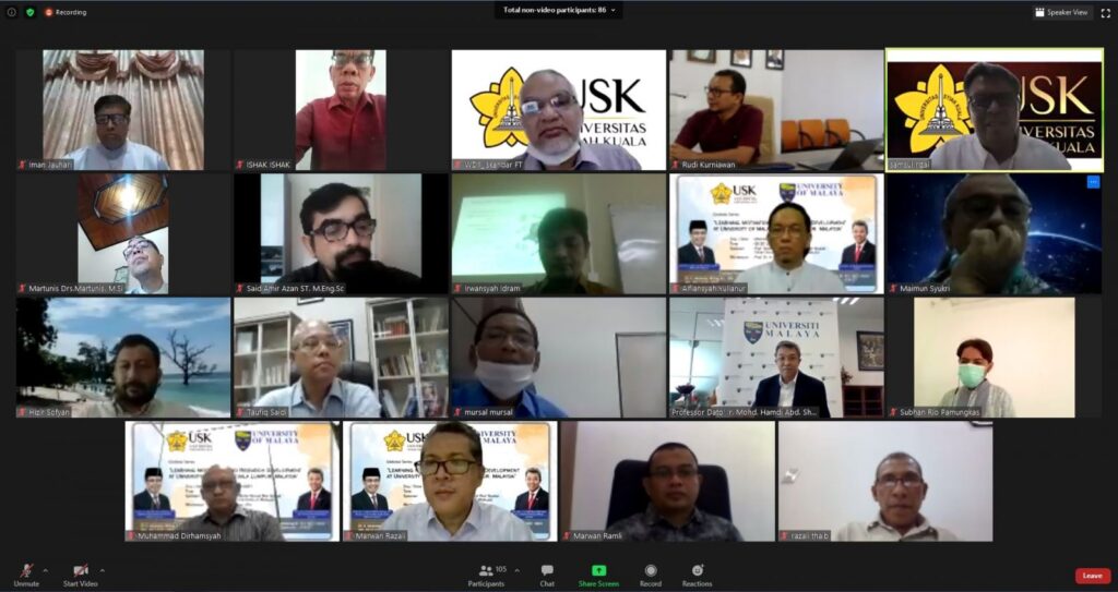 Rektor USK Prof. Dr. Ir. Samsul Rizal, M.Eng dalam sambutannya mengatakan, dirinya menyampaikan rasa terima kasih atas kesediaan Prof. Hamdi yang telah hadir secara daring untuk sharing pengalamannya dalam memimpin University Malaya.