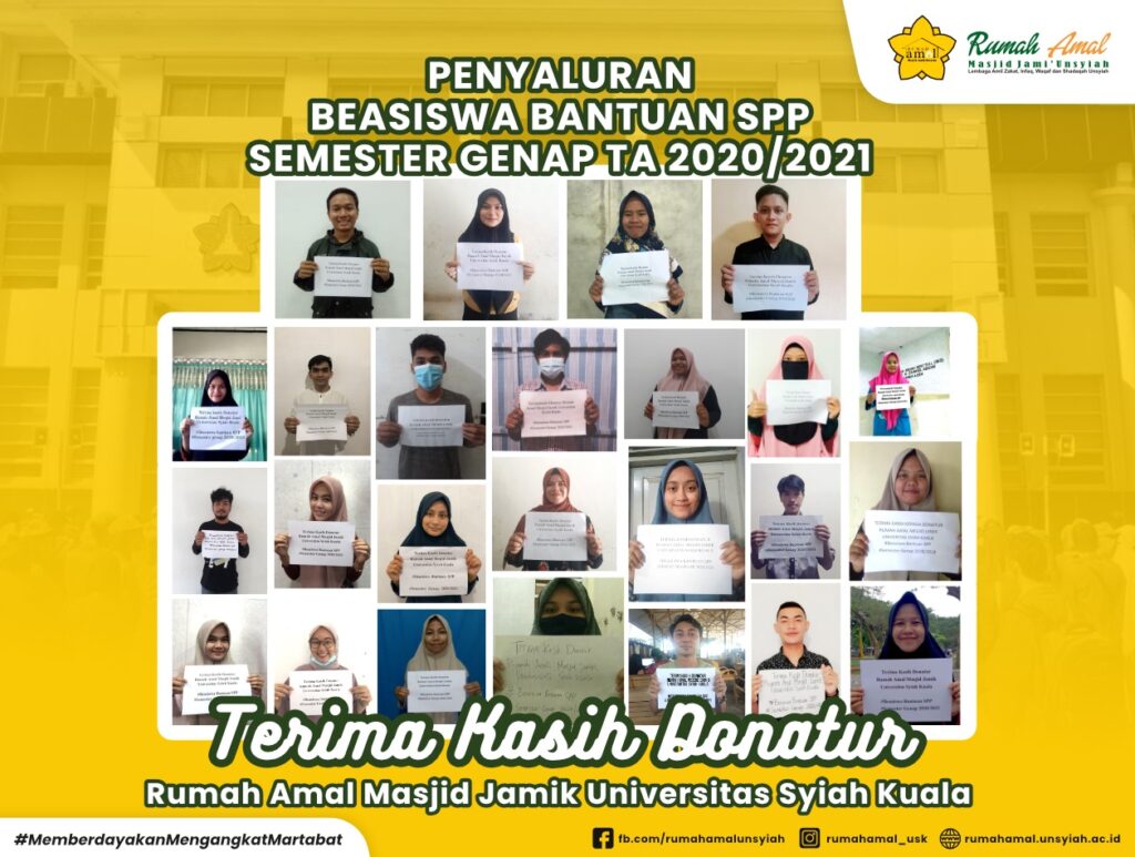 Program Beasiswa Bantuan SPP Semester Genap Tahun Ajaran 2020/2021 Rumah Amal kembali begulir. Program ini ditujukan bagi mahasiswa jenjang D3, S1 dan Profesi dari berbagai fakultas di Universitas Syiah Kuala (USK) yang memiliki keterbatasan ekonomi. Bantuan dana SPP ini diberikan dalam satu kali penyerahan.