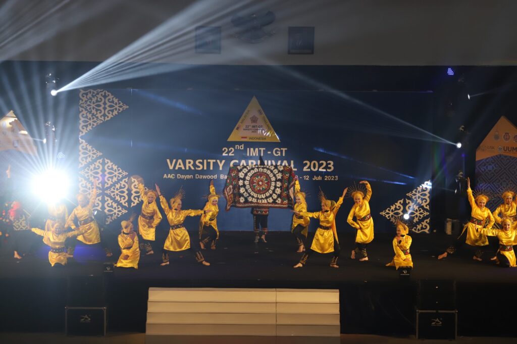 Tarian tradisional dari tiga negara peserta The Indonesia-Malaysia-Thailand Growth Triangle (IMT-GT) Varsity Carnival yang ke-22 (IMT-GT) yaitu Indonesia, Malaysia dan Thailand tampil menyemarakan opening ceremony IMT-GT di Gedung AAC Dayan Dawood Universitas Syiah Kuala. (Banda Aceh, 9 Juli 2023).