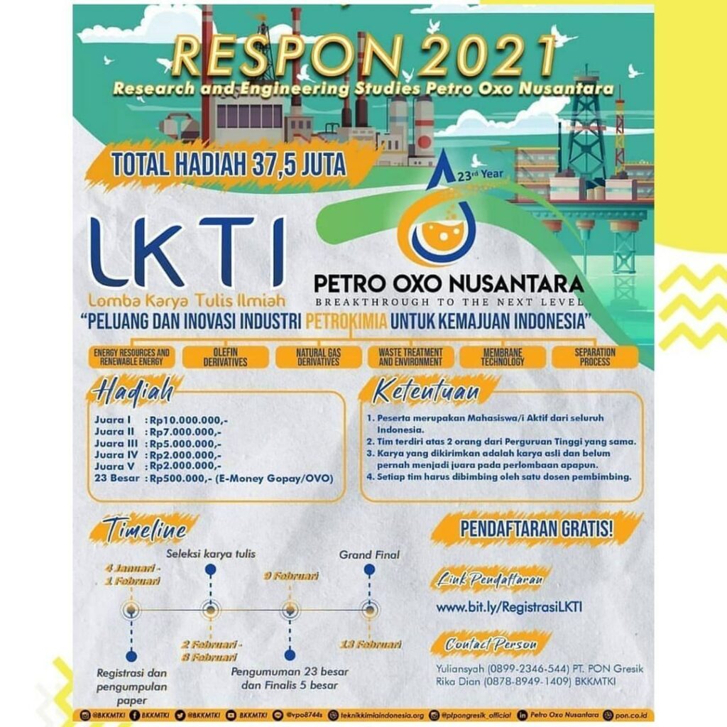 RESPON 2021 merupakan lomba karya tulis ilmiah tingkat nasional sebagai wadah bagi mahasiswa Indonesia dalam upaya membantu pemerintah merealisasikan pemaksimalan industri petrokimia. Kegiatan ini juga menjadi sarana mahasiswa memberikan gagasan, ide, menjalin sinergitas, serta membangun relasi.