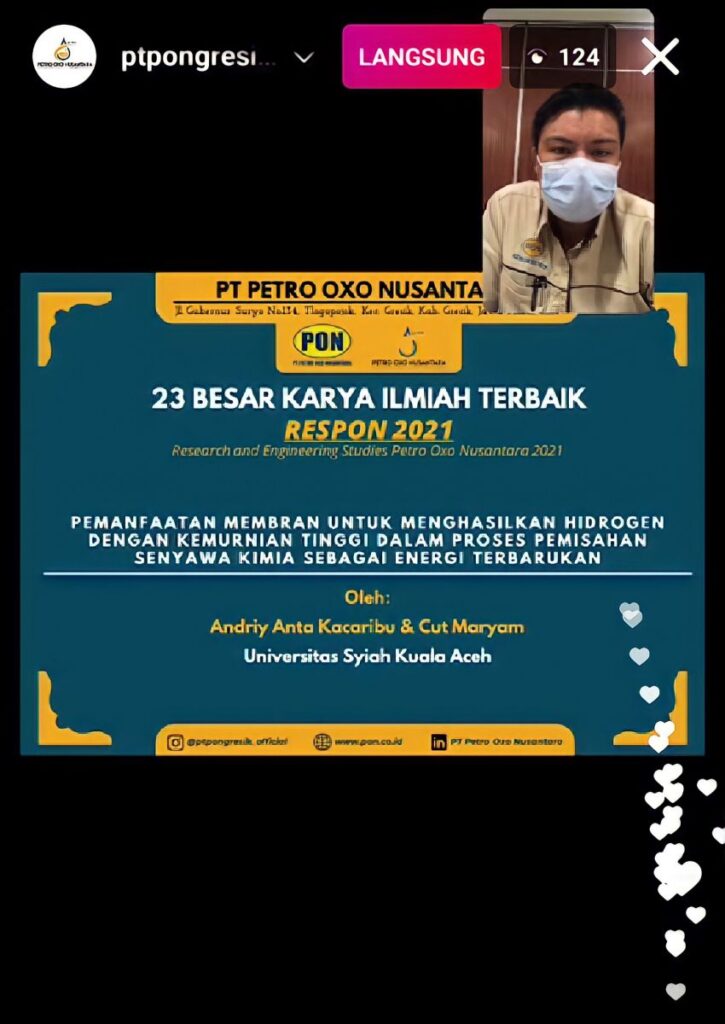 Tim Universitas Syiah Kuala (USK) yang diwakili oleh Andriy Anta Kacaribu dan Cut Maryam (FMIPA Kimia 2018) berhasil masuk ke-23 besar dalam ajang Research and Engineering Studies Petro Oxo Nusantara (RESPON) 2021. Dalam kompetisi karya tulis ilmiah yang diadakan oleh Petro Oxo Nusantara ini, tim USK dibimbing oleh Prof. Dr. Rahmi, salah satu dosen FMIPA USK. Meski belum berhasil melaju ke tahap final, tim USK telah mengalahkan ratusan peserta lainnya yang mengikuti ajang ini, sehingga berhasil menempati posisi ke-23.