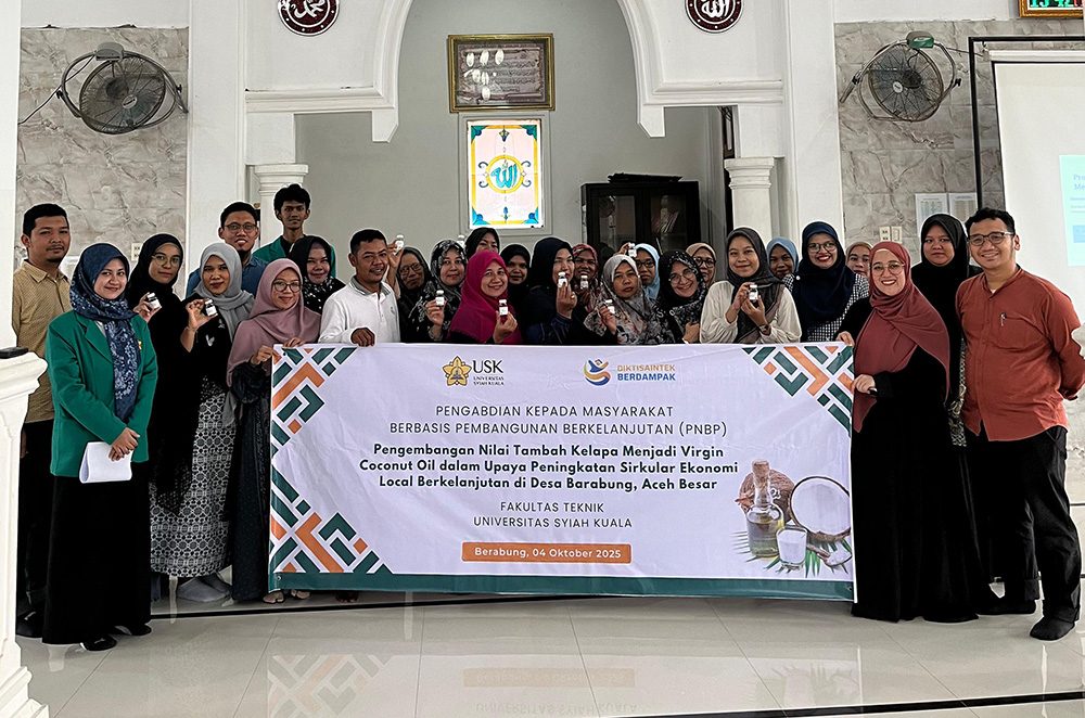 Universitas Syiah Kuala (USK) melalui tim dosen Fakultas Teknik melaksanakan program Pengabdian Kepada Masyarakat (PKM) di Desa Barabung, Kecamatan Darussalam, Aceh Besar. Program ini dirancang untuk membantu masyarakat, khususnya ibu rumah tangga, dalam meningkatkan nilai tambah produk kelapa lokal menjadi Virgin Coconut Oil (VCO) berkualitas tinggi. Aceh Besar, 4 Oktober 2025.