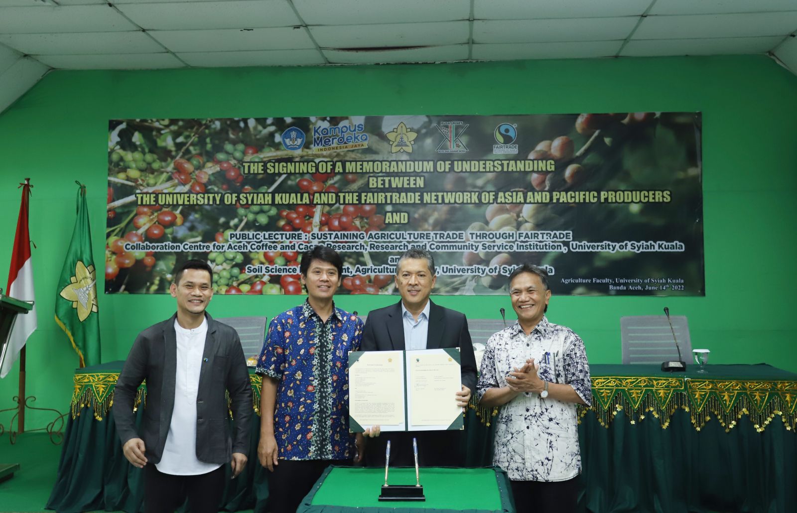 Fakultas Pertanian Universitas Syiah Kuala (FP USK) melalui Pusat Riset Kopi dan Kakao kampus setempat, menandatangani kerjasama (MoU) dengan Fairtrade Network of Asia and Pacific Producers (Fairtrade NAPP). Kegiatan ini berlangsung di Multi Purpose Room FP USK. (Banda Aceh, Selasa 14 Juni 2022)