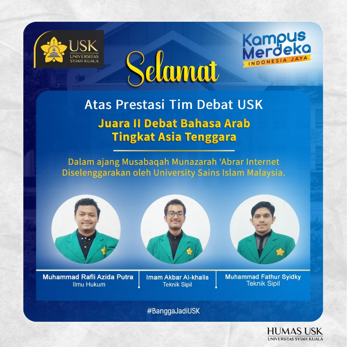 Mahasiswa Universitas Syiah Kuala (USK) kembali mengukir prestasi dan mengharumkan nama Aceh di ajang internasional. Prestasi tersebut yakni meraih Juara II Debat Bahasa Arab tingkat Asia Tenggara, pada ajang Musabaqah Munazarah ‘Abrar Internet (MU’IN), yang diselenggarakan secara daring oleh Universiti Sains Islam Malaysia (USIM) pada 3-4 April 2021.