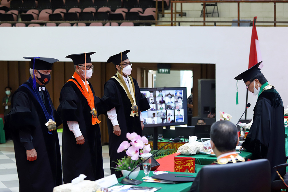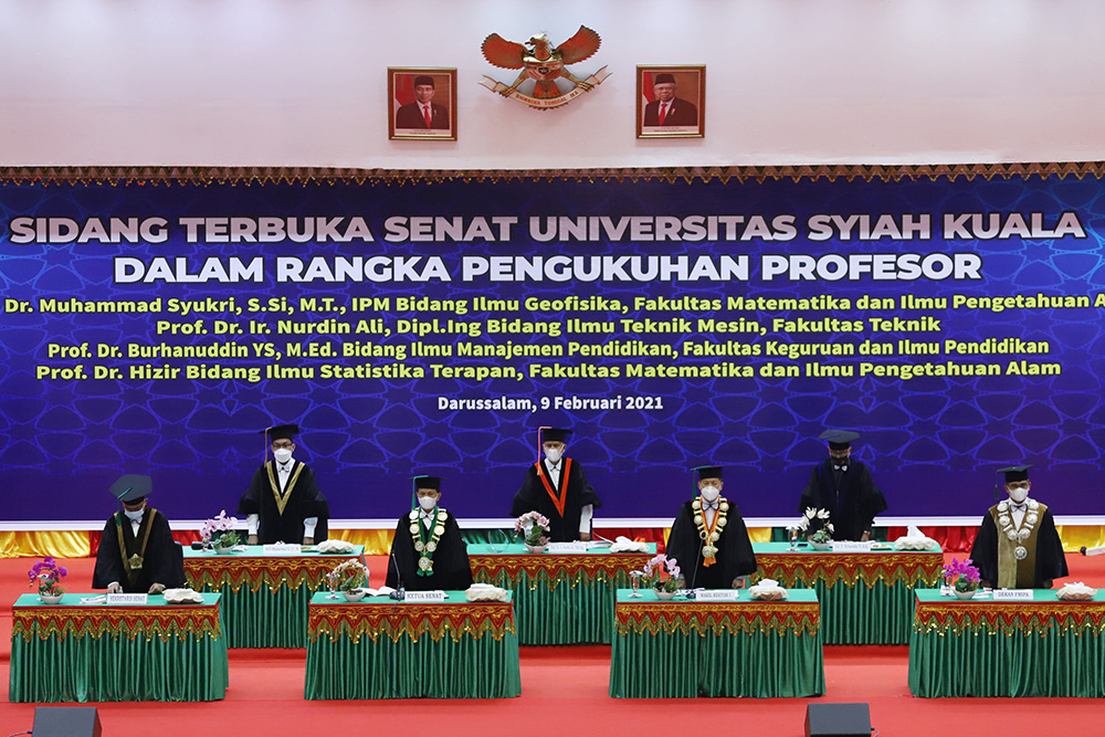 Universitas Syiah Kuala kembali mengukuhkan tiga profesor baru dalam Sidang Senat Terbuka yang dipimpin oleh Ketua Senat USK Prof.  Dr. Ir.  Abubakar, MS yang dilaksanakan secara daring dan luring dari Gedung AAC Dayan Dawood. (Banda Aceh, 9 Februari 2021).