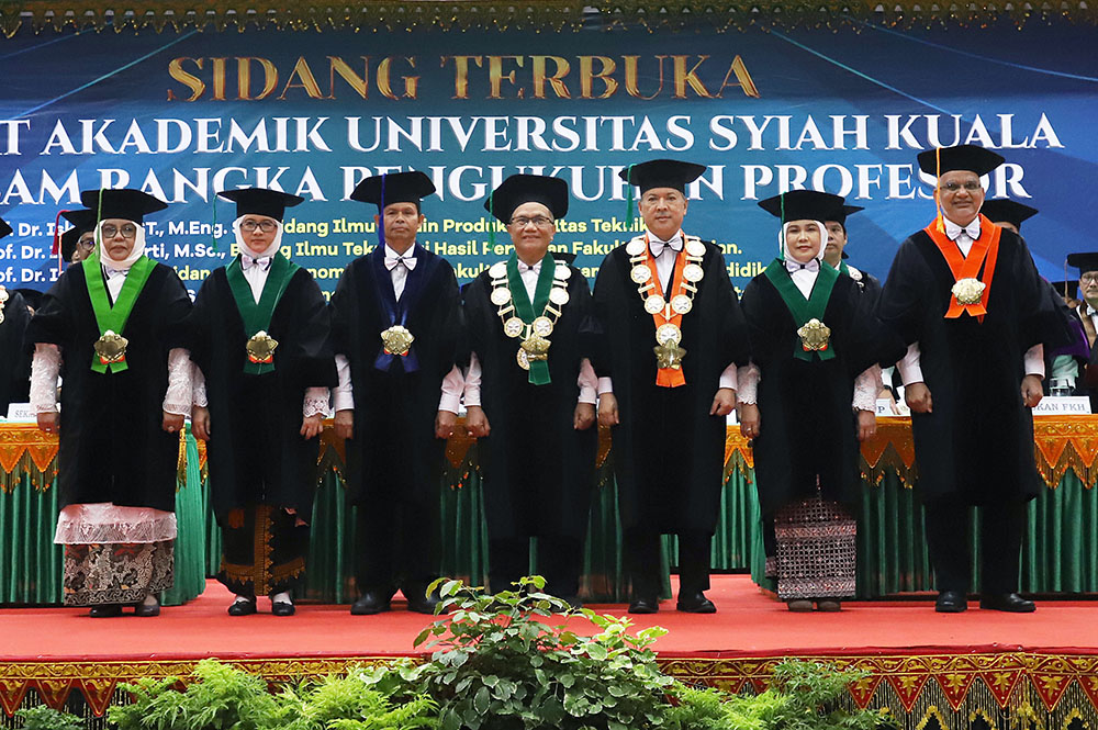 Universitas Syiah Kuala (USK) melalui Sidang Terbuka Senat Akademik Universitas mengukuhkan lima profesor baru yang merupakan para pakar dari berbagai bidang keilmuan. Pengukuhan ini dipimpin oleh Ketua Senat Akademik Universitas Prof. Dr. Abubakar, M.Si di Gedung AAC Dayan Dawood, Banda Aceh, Kamis, 16 November 2023.