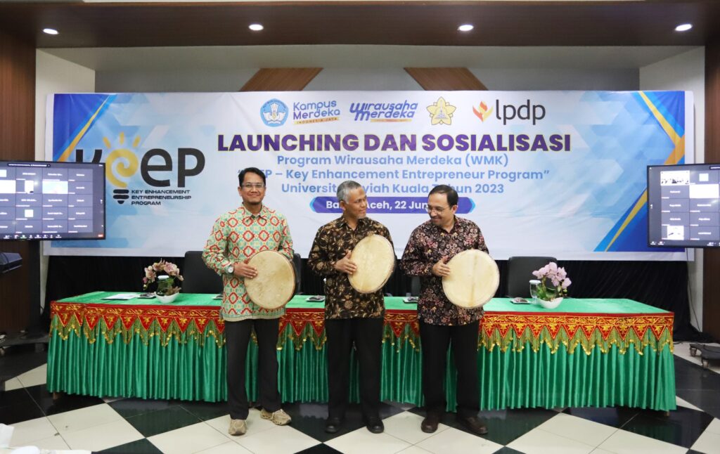 Universitas Syiah Kuala secara resmi me-launching Program Wirausaha Merdeka (WMK) Keep: Key Enhancement Entrepreneur Program Tahun 2023. Hal ini ditandai dengan pemukulan rapai yang dipimpin oleh Wakil Rektor Bidang Kemahasiswaan dan Kewirausahaan USK Prof. Dr. Mustanir, M.Sc di Ruang VIP AAC Dayan Dawood. (Banda Aceh, 22 Juni 2023).