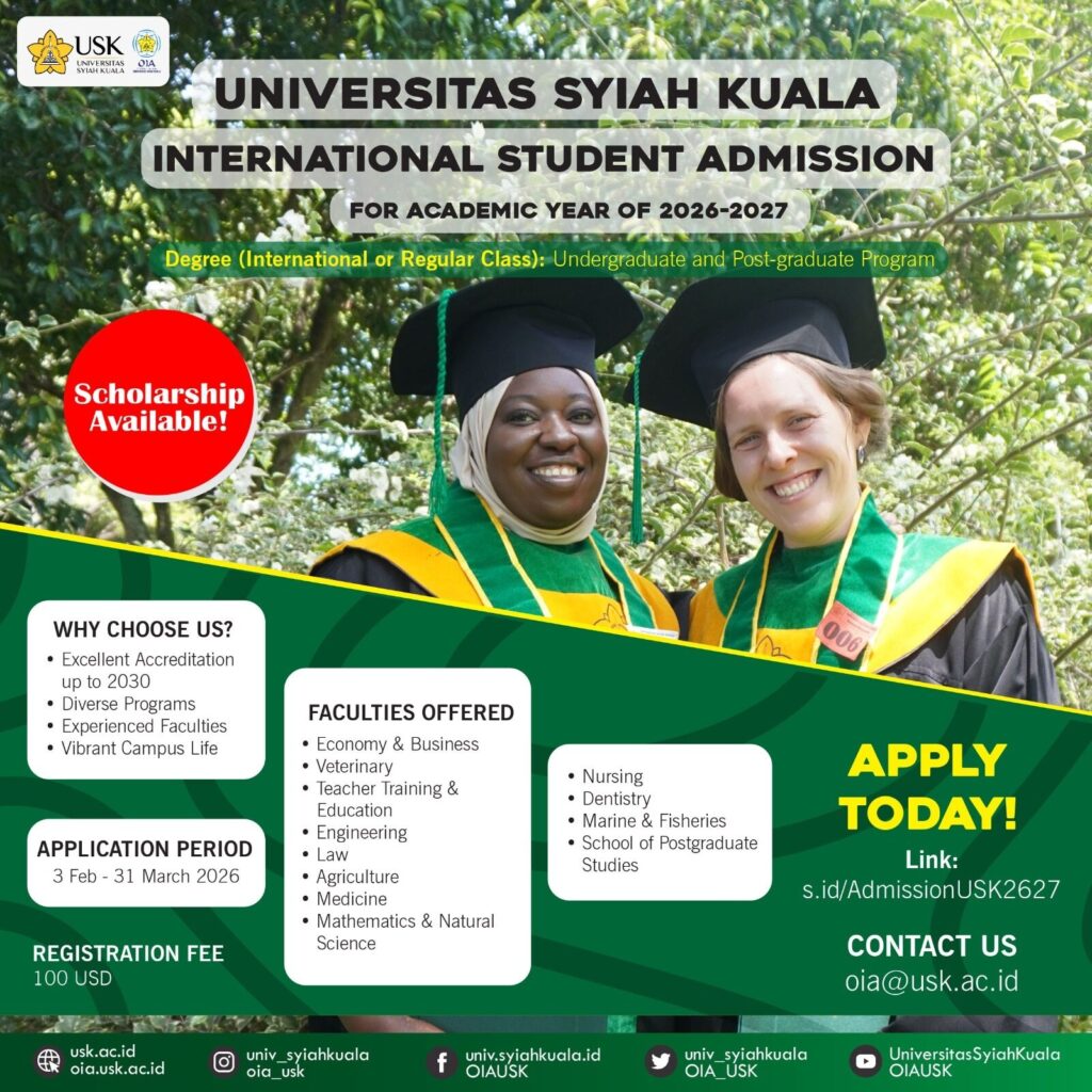 Universitas Syiah Kuala (USK) melalui Kantor Urusan Internasional (Office of International Affairs – OIA) resmi membuka Penerimaan Mahasiswa Internasional (International Student Admission) untuk Tahun Akademik 2026–2027. Program ini ditujukan bagi warga negara asing yang ingin menempuh pendidikan di jenjang Sarjana (Undergraduate) maupun Pascasarjana (Postgraduate), baik untuk kelas internasional maupun reguler.