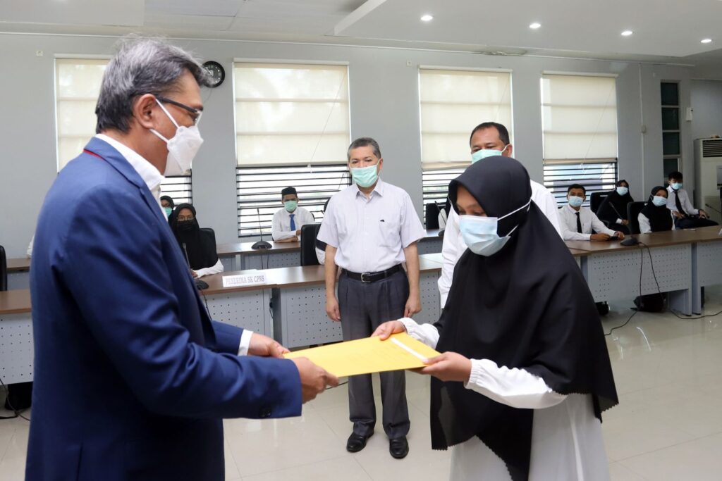 Sebanyak 21 Calon Pegawai Negeri Sipil Universitas Syiah Kuala formasi tahun anggaran 2020 menerima Surat Keputusan Pengangkatan menjadi pegawai USK. Penyerahan SK tersebut dilaksanakan di Balai Senat USK. (Banda Aceh, 1 Februari 2021).