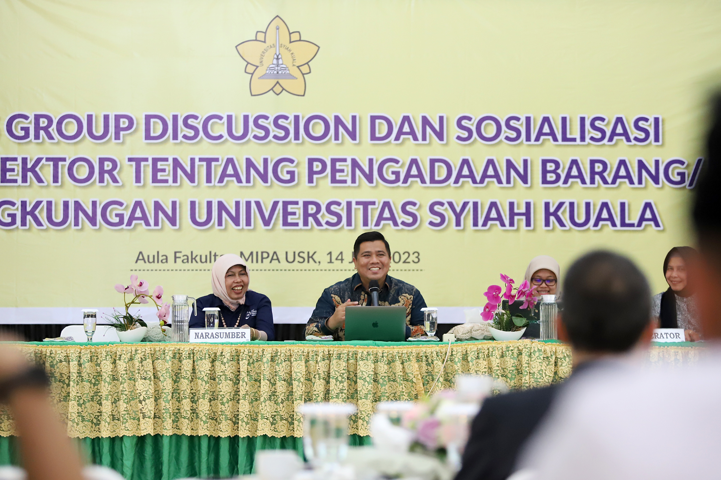 Universitas Syiah Kuala menggelar Focus Group Discussion (FGD) dan sosialisasi rancangan Peraturan Rektor tentang Pengadaan Barang/Jasa di lingkungan kampus ini. Kegiatan tersebut dibuka oleh Rektor USK Prof. Dr. Ir. Marwan di Aula Fakultas Matematika dan Ilmu Pengetahuan Alam (FMIPA) USK. (Banda Aceh, 14 Juni 2023).