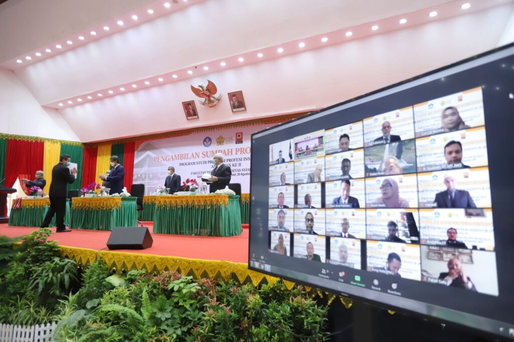 Upacara Pengambilan Sumpah Insinyur lulusan angkatan II USK, turut dihadiri Ketua Umum Persatuan Insiyur Indonesia (PII) Pusat, Dr. Ir. Heru Dewanto, M.Sc.Eng, IPU., ASEAN.Eng., APCE. Berhubung Banda Aceh masih berstatus PPKM level 4, dirinya tidak bisa hadir secara langsung, namun mengikuti rangkaian tersebut secara daring.