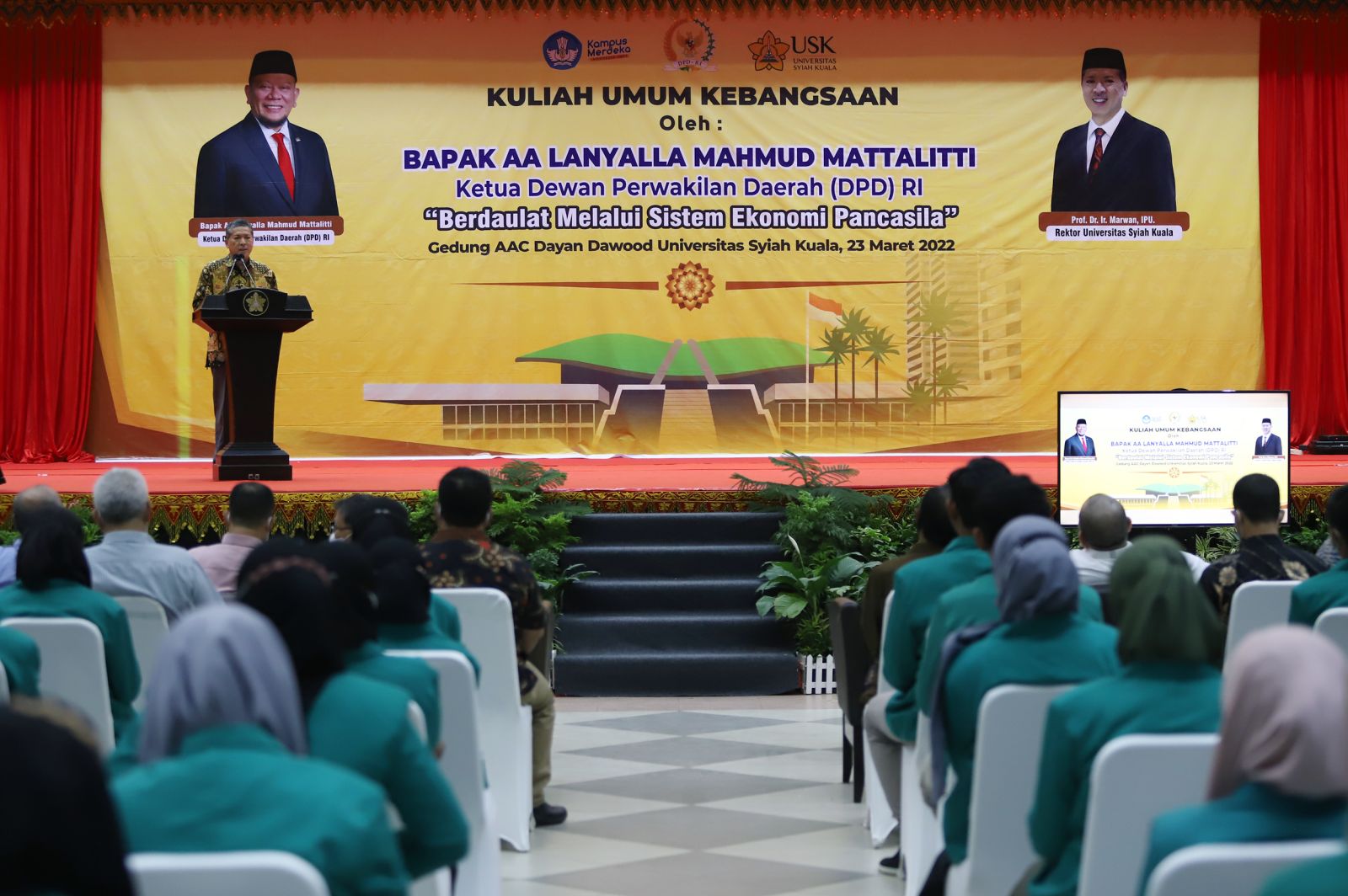 Universitas Syiah Kuala terus memperkuat komitmennya untuk mendukung upaya pemerintah dalam mewujudkan kedualatan ekonomi nasional. Pernyataan tersebut disampaikan oleh Rektor USK Prof. Dr. Ir. Marwan pada kuliah umum Ketua Dewan Perwakilan Daerah (DPD) di Gedung AAC Dayan Dawood. (Banda Aceh, 24 Maret 2022).