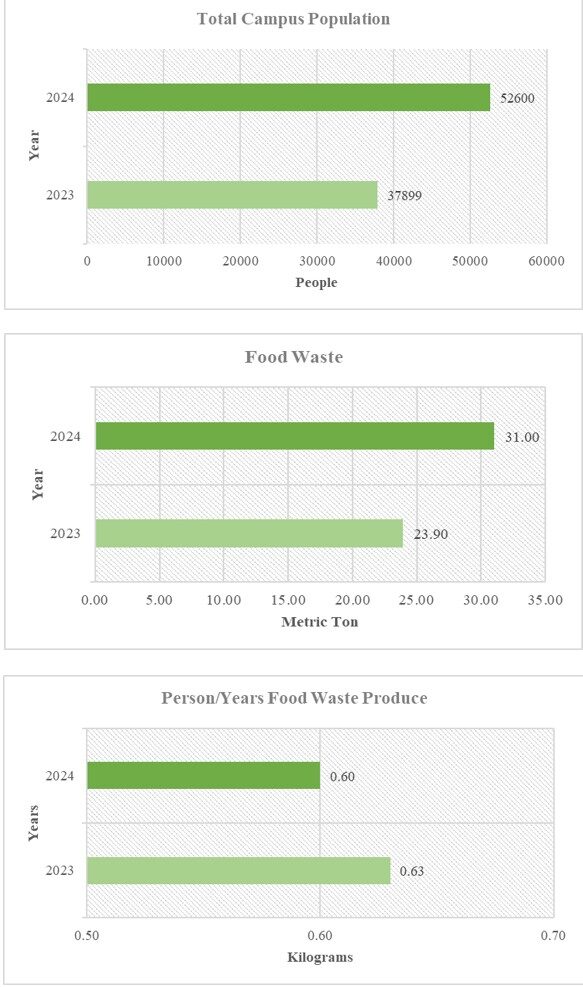 Kenaikan jumlah warga kampus ini turut berdampak pada peningkatan total limbah makanan, dari 23,9 metrik ton pada 2023 menjadi 31 metrik ton pada 2024 (naik 29,71% persen). Meski demikian, hasil analisis menunjukkan adanya efisiensi dalam produksi sampah per individu, dengan penurunan dari 0,63 kg menjadi 0,60 kg per orang per tahun (turun sekitar 4,8%).